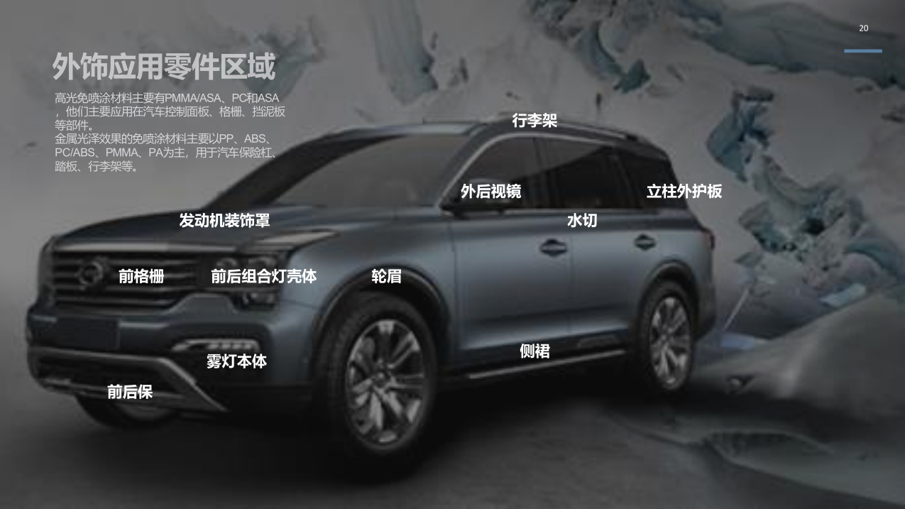 免噴涂PP:材料具有高光澤、易成型、耐刮擦、可回收的特點(diǎn),可應(yīng)用于家電外殼、汽車(chē)配件等 ;